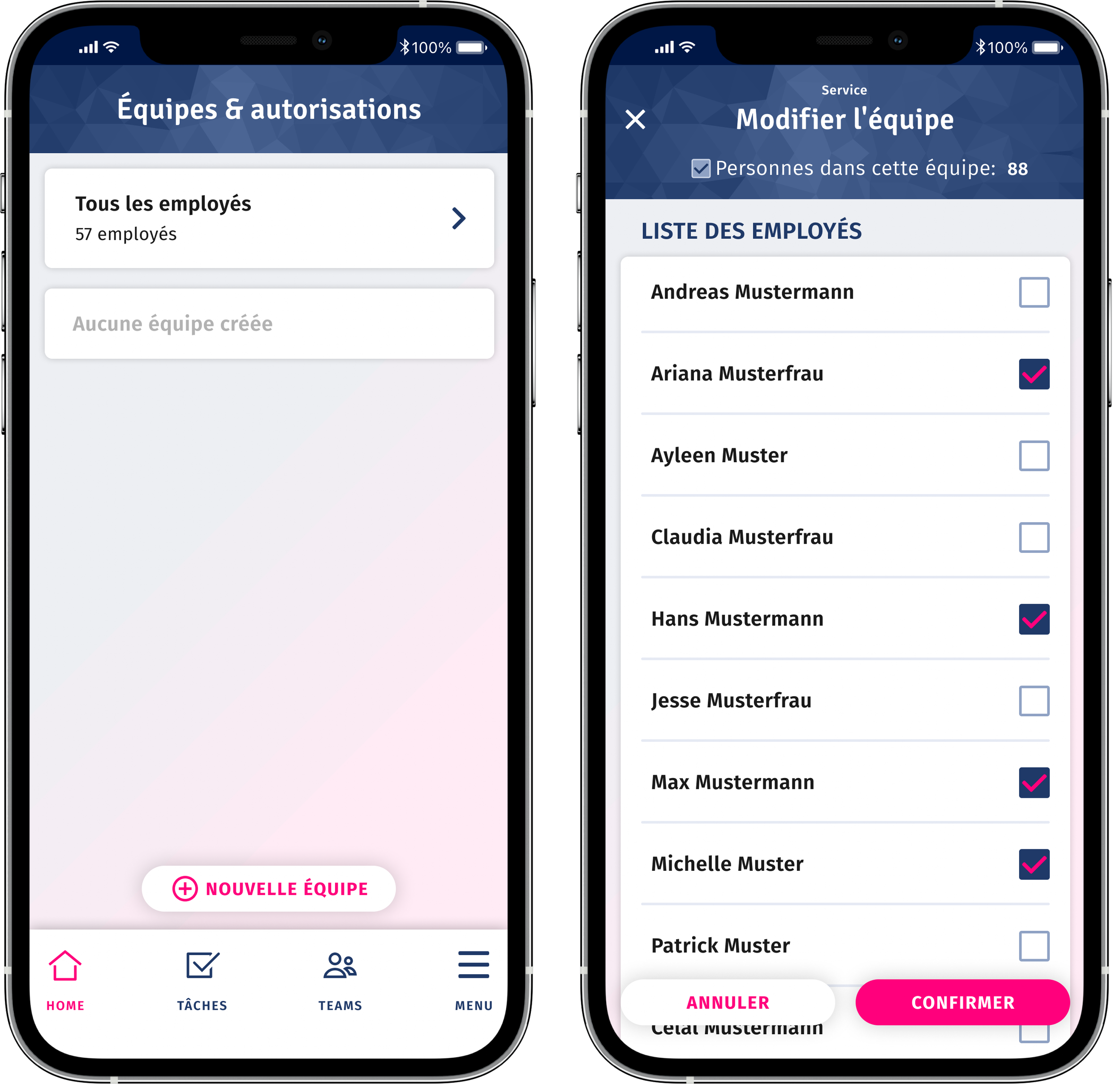Attribuez les autorisations par équipe. Pour chaque type de tâche, l'autorisation doit être attribuée au moins une fois. Vous pouvez attribuer des autorisations plusieurs fois, par exemple pour les suppléants.